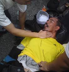 Beberapa saat kemudian saya mendengar suara memangggil: “Kak... kak.” Saya menoleh. Saya melihat peserta berbaju biru, (yang sebelumnya senyum pada saya, kerana mengambil gambarnya) “tergolek” ke jalan sambil mata terpejam dan mengerang kesakitan.